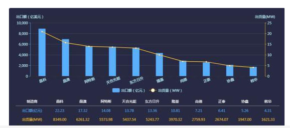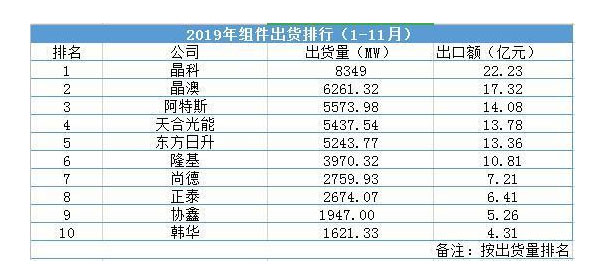 根據(jù)2019年1-11月組件海外出貨量,智新咨詢(xún)預(yù)測(cè)2019年組件海外出貨量和出口額前三名為晶科、晶澳、阿特斯。
