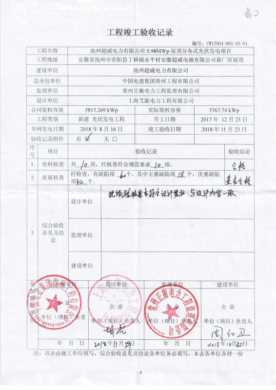 《每日經(jīng)濟新聞》記者獲取的一份池州超威5.98MW屋頂分布式光伏電站項目工程竣工驗收記錄顯示,該項目于2018年8月16日并網(wǎng)發(fā)電,竣工驗收日期為2018年11月23日,資料核查項目為合格,質(zhì)量核查為基本合格。設(shè)計單位在綜合驗收意見及結(jié)論注明:現(xiàn)場驗收基本符合設(shè)計要求、與設(shè)計內(nèi)容一致??偝邪鼏挝弧⒃O(shè)計單位、監(jiān)理單位均在該驗收記錄上蓋章確認(rèn)。