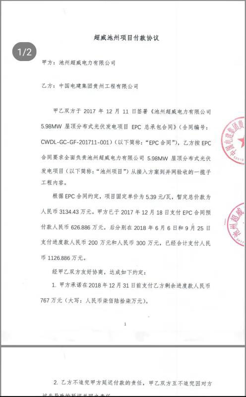 池州超威與貴州電建于2018年12月25日簽訂的《超威池州項目付款協(xié)議》顯示,池州超威于2017年12月18日支付EPC合同預(yù)付款626.9萬元,后分別在2018年6月6日和9月25日支付進(jìn)度款200萬元和300萬元。