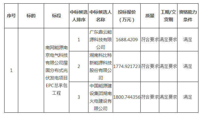 近日,南網(wǎng)能源南京電氣科技有限公司屋面分布式光伏發(fā)電項(xiàng)目EPC總承包工程結(jié)果公示,據(jù)公告顯示,該項(xiàng)目總規(guī)模為5.98114MW,其中,廣東鼎云能源科技有限公司以2.82元/W,共計(jì)1688.4209萬元位列第一中標(biāo)候選人;湖南科比特新能源科技股份有限公司以2.97元/W,共計(jì)1774.921723萬元位列第二中標(biāo)候選人;中國能源建設(shè)集團(tuán)湖南火電建設(shè)有限公司以3.01元/W,共計(jì)1800.744356萬元位列第三中標(biāo)候選人。