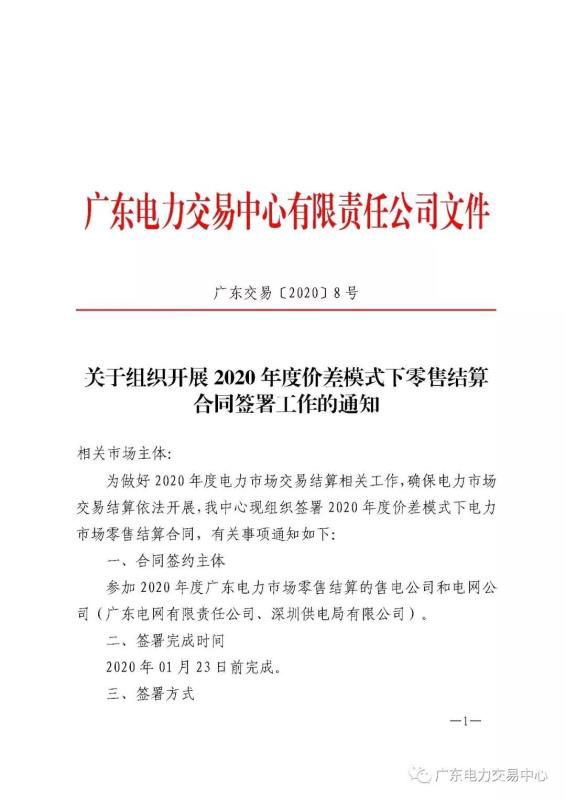 近日,廣東電力交易中心下發(fā)2020年度電力市場(chǎng)交易結(jié)算相關(guān)工作的相關(guān)通知,并組織簽署2020年度價(jià)差模式下電力市場(chǎng)零售結(jié)算合同。