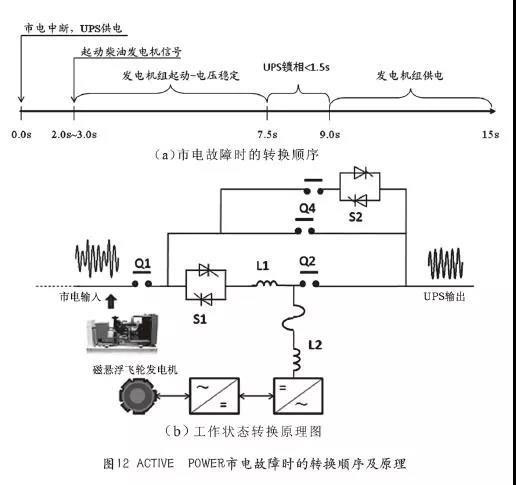 當市電正常時,市電通過自動切換開關(guān)進入濾波補償柜(暫這樣稱呼)將輸入電壓正弦波中的干擾和失真加以整理,使其送到關(guān)鍵負載的電壓波是高質(zhì)量的。一旦市電故障或異常,自動切換開關(guān)就斷開市電并送出柴油發(fā)電機起動命令,同時率波補償柜一方面給增強型發(fā)電機啟動模塊用之發(fā)電機發(fā)電也同時接通柴油發(fā)電機的24V起動電池啟動柴油發(fā)動機。在這里需要說明的是柴油發(fā)電機的發(fā)電機和增強型發(fā)電機啟動模塊不是同一個裝置,它是磁懸浮飛輪發(fā)電機。對該系統(tǒng)的整個工作由系統(tǒng)標配的監(jiān)控軟件來監(jiān)控和分析。圖12(a)為ACTIVEPOWER市電故障時的轉(zhuǎn)換時間順序。為了方便介紹,假如市電在0.0s停電,在2.0s~3.0s之間發(fā)出柴油發(fā)電機起動信號,一般柴油發(fā)動機5s就可以達到額定轉(zhuǎn)數(shù),到7.5s時柴油發(fā)電機已經(jīng)達到額定轉(zhuǎn)數(shù),但此時儲能飛輪的轉(zhuǎn)數(shù)尚未降到和柴油發(fā)電機同步的程度,所以柴油發(fā)電機此時處于空轉(zhuǎn)等待狀態(tài),大概等待1s左右儲能飛輪的轉(zhuǎn)數(shù)和柴油發(fā)電機同步了,即柴油發(fā)電機的輸出電壓頻率和相位與磁懸浮飛輪發(fā)電機發(fā)出的電壓經(jīng)一系列變換后的輸出電壓一致了,二者馬上鎖相,此后的負載供電就就由柴油發(fā)電機來代替了,這整個過程必須在15s以內(nèi)完成,一直到市電恢復(fù)。