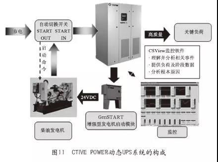一旦市電恢復(fù)正常,市電則立即給磁懸浮飛輪儲能裝置進行“充電”,使飛輪的轉(zhuǎn)速又回復(fù)到7700r/min。圖11表示的是CTIVEPOWER動態(tài)儲能UPS系統(tǒng)的構(gòu)成情況。