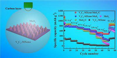 圖2. V4C3-MXene/MoS2/C復(fù)合材料的結(jié)構(gòu)示意圖和倍率性能。