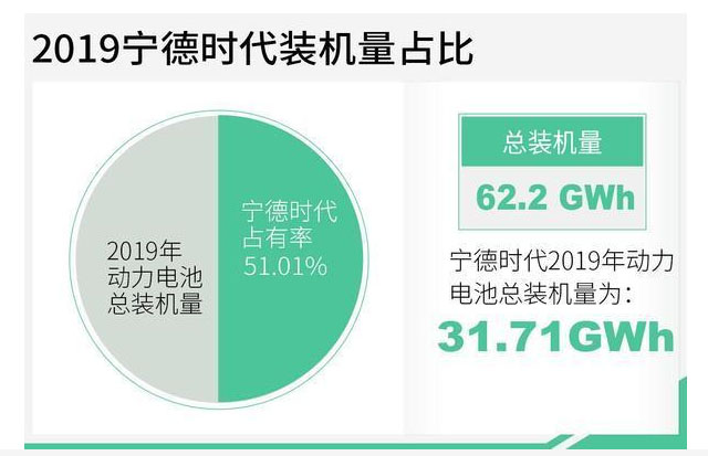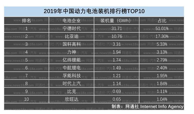 數(shù)據(jù)顯示動(dòng)力電池裝機(jī)量前十的廠(chǎng)家,2019年共計(jì)裝機(jī)54.64GWh,占比高達(dá)87.9%,較2018年前十名企業(yè)的裝機(jī)量增長(zhǎng)5%。寧德時(shí)代、比亞迪、國(guó)軒高科名列前三,動(dòng)力電池裝機(jī)量分別為31.71GWh、10.76GWh、3.31GWh。寧德時(shí)代以31.71GWh的絕對(duì)優(yōu)勢(shì)勝出,并占據(jù)動(dòng)力電池市場(chǎng)的半壁江山,占比較2018年提升9.86個(gè)百分點(diǎn)。