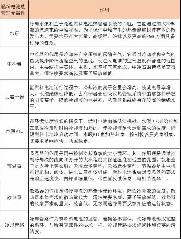 氫燃料電池的熱管理系統(tǒng)將電堆反應(yīng)生成的熱量排出系統(tǒng)外,使電堆維持在適合的溫度區(qū)間工作。事實上,燃料電池?zé)峁芾硐到y(tǒng)主要包括燃料電池?zé)峁芾恚ㄈ剂想姵乇倔w)和動力系統(tǒng)平臺熱管理兩部分。從燃料電池系統(tǒng)熱管理的元器件組成來看,又主要由水泵、節(jié)溫器、去離子器、中冷器、水暖PTC、冷卻模塊及冷卻管路等不同部分組成。