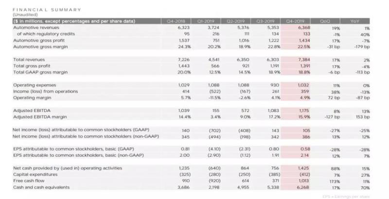 財報顯示,特斯拉在2019年第四季度營收73.84億美元,同比增長2%,凈利潤為1.32億美元,去年同期該數(shù)字2.10億美元;歸屬于普通股股東的凈利潤為1.05億美元,同比下降25%。這是繼2018年連續(xù)兩個季度盈利后,特斯拉再次實現(xiàn)連續(xù)兩季度盈利。