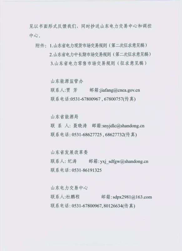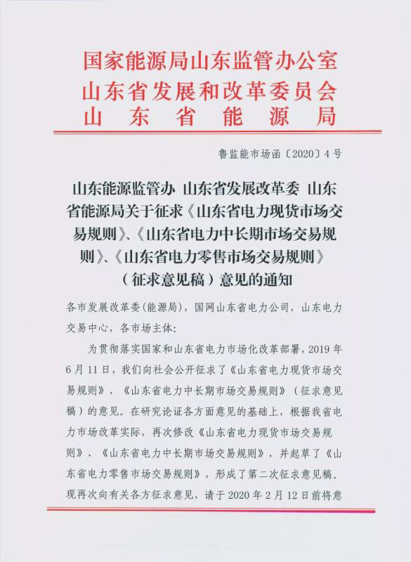 山東為貫徹落實國家和山東電力市場化改革部署,2019年6月11日,山東省向社會公開征求了 《山東省電力現貨市場交易規(guī)則》、《山東省電力中長期市場交易規(guī)則》( 征求意見稿)的意見。在研究論證各方面意見的基礎上,根據山東省電力市場改革實際,再次修改《山東省電力現貨市場交易規(guī)則》、《山東省電力中長期市場交易規(guī)則》,并起草了《山東省電力零售市場交易規(guī)則》,形成了第二次征求意見稿?,F再次向有關各方征求意見,并請求社會各界于2020年2月12日前將意見反饋。