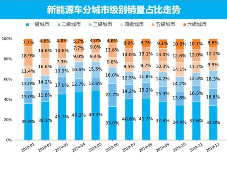 12月新能源車銷量最高的城市級別為一級城市,銷量為2.9萬輛,銷量占比為33.8%,比上個月下跌了3.8個百分點(diǎn);與2018年同期相比,一級城市上漲1.8個百分點(diǎn),高線級城市配套設(shè)施完善,直接影響到新能源車的銷量走勢。銷量最低的城市級別為六級城市,銷量僅為0.7萬輛,銷量占比為8.8%,比上個月下跌了1.3個百分點(diǎn);與2018年同期相比,六級城市上漲1.2個百分點(diǎn),隨著新戶籍政策的放開及高線級城市購車限號的影響,低線級會帶來新的一輪新能源銷量熱潮。