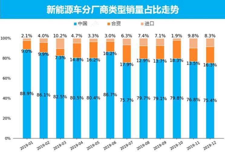 從新能源市場單月銷量情況來看,2019年12月共銷售了8.5萬輛,占整個市場銷量的3.5%。原本是沖量最高峰的12月,環(huán)比增幅僅有35.7%,遠(yuǎn)不如2018年底環(huán)比164.8%的增幅,同比也下跌了63.6%。在整體市場持續(xù)低迷和經(jīng)濟(jì)低速增長的大環(huán)境下,新能源車增長動力不足,銷量增速日益收窄。
