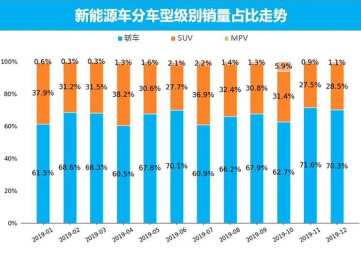 從車型級別銷量來看,12月份新能源轎車銷量為6.0萬輛,銷量占比為70.3%,較上個月下滑1.3個百分點(diǎn);與2018年同期相比,轎車銷量占比下跌2.7個百分點(diǎn)。新能源SUV銷量為2.4萬輛,銷量占比為28.5%,較上個月增長1個百分點(diǎn);與2018年同期相比,SUV銷量占比上漲2.9個百分點(diǎn)。新能源MPV銷量為959輛,銷量占比僅為1.1%,銷量占比與上個月增長0.2個百分點(diǎn);與2018年同期相比,MPV銷量占比下跌0.4個百分點(diǎn)。