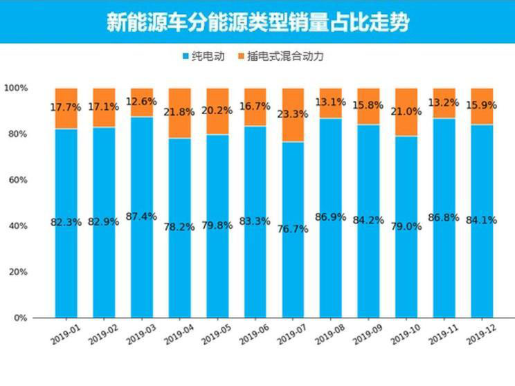 從能源類型角度來看,12月純電動車型銷量為7.1萬輛,同比下跌67.6%,銷量占比為84.1%,純電動車型仍占據(jù)著新能源車的主要市場份額;插電式混合動力車型銷量為1.4萬輛,同比上漲3.3%,銷量占比為15.9%。從近12個月的市場銷量占比情況來看,插電式混動與純電動車型基本上是“二八開”的局面。