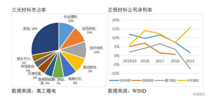 行業(yè)同樣處于降價(jià)趨勢(shì)中,多個(gè)龍頭毛利率有下降,當(dāng)升科技卻有上升。相比于其他幾個(gè)配件,正極行業(yè)相對(duì)分散。LG正極供應(yīng)商包括當(dāng)升科技和杉杉股份。