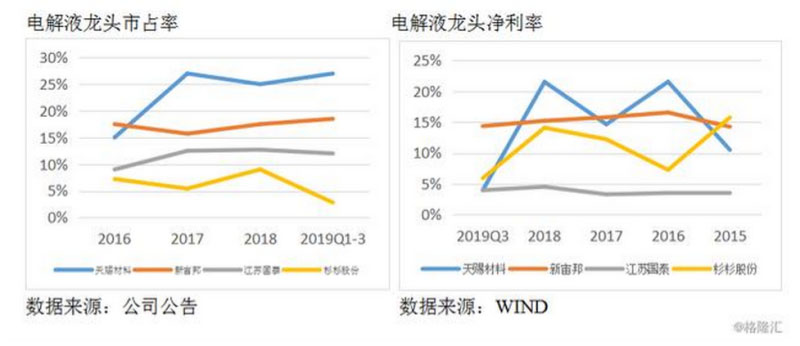 電解液2018年經(jīng)歷價(jià)格戰(zhàn)后凈利率有降低,天賜材料和新宙邦的市占率有顯著上升。 尤其是新宙邦,凈利率沒(méi)有下降,市占率還略有提升。