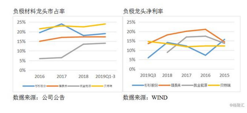負(fù)極加工環(huán)節(jié)較多,通過(guò)布局石墨化、碳化加工等環(huán)節(jié),可顯著降低制造費(fèi)用。因此,隨競(jìng)爭(zhēng)加劇,產(chǎn)業(yè)鏈縱向布局越發(fā)重要,龍頭優(yōu)勢(shì)愈加明顯。負(fù)極材料今年價(jià)格在下降,龍頭凈利率出現(xiàn)明顯下降,國(guó)內(nèi)企業(yè)的優(yōu)勢(shì)也更加明顯。