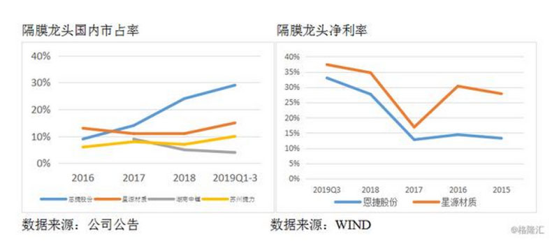 在幾個(gè)板塊中相對(duì)海外競(jìng)爭(zhēng)力較強(qiáng),2019年Q1-Q3國(guó)內(nèi)隔膜廠出貨18.6億平米,同比增長(zhǎng)40%,最具投資價(jià)值。隔膜單價(jià)最近3年下滑50%以上,雖然龍頭凈利率在30%以上,但是由于隔膜重資產(chǎn)特性,價(jià)格進(jìn)一步下降空間有限。