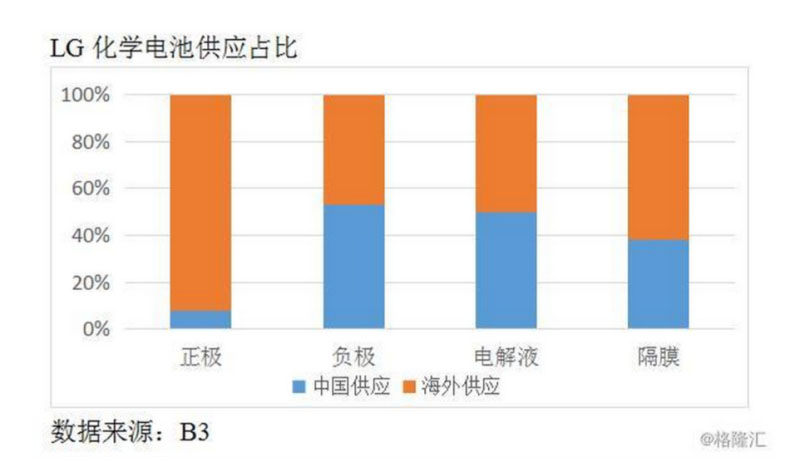 從為L(zhǎng)G化學(xué)供貨的各部分來(lái)看,正極部分因?yàn)長(zhǎng)G化學(xué)自產(chǎn),我國(guó)占比不足5%。在負(fù)極、電解液環(huán)節(jié),中國(guó)供應(yīng)份額超過(guò)50%,隔膜接近占比40%。