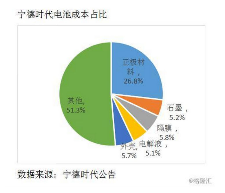由于我國(guó)的電池產(chǎn)業(yè)鏈成本較低,除了供應(yīng)國(guó)內(nèi)電池廠商外,部分優(yōu)質(zhì)公司進(jìn)入了LG電池供應(yīng)體系。電池上游主要是正極、負(fù)極、電解液、隔膜。其中正極材料質(zhì)量占比最高,成本也最高,以寧德時(shí)代為例,正極占比達(dá)到26.8%,其余三項(xiàng)占比差不多都在5%左右。