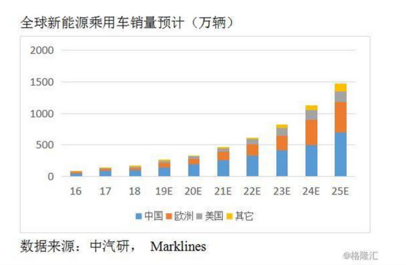 由于大眾、奔馳等車企密集上市新能源汽車,2020-2021年將是歐洲新能源汽車市場(chǎng)爆發(fā)的關(guān)鍵時(shí)點(diǎn)。根據(jù)Marklines數(shù)據(jù)預(yù)測(cè),2019-2021年歐洲新能源車產(chǎn)銷規(guī)模將分別達(dá)50/72/110萬(wàn)輛,2025年將達(dá)457萬(wàn)輛,而歐洲電池供應(yīng)商主要是LG化學(xué)和CATL。我國(guó)新能源汽車在2020年后將迎來(lái)快速增長(zhǎng),2025年達(dá)到700萬(wàn)輛左右。電池白名單解除后,LG化學(xué)為越來(lái)越多國(guó)內(nèi)廠商供貨。