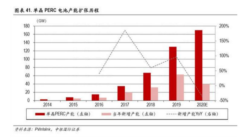 我們預(yù)計(jì),目前異質(zhì)結(jié)電池非硅成本水平大致位于 0.6-0.7元/W區(qū)間,相對(duì)于 0.4-0.5元/W的目標(biāo)仍有 一定幅度的差距。就非硅成本的組成而言,異質(zhì)結(jié)電池在低溫銀漿、設(shè)備折舊、靶材耗用等方面均 有較大的降本潛力。此外,MBB 多主柵等工藝改進(jìn)亦有望在降低輔材消耗的同時(shí)提升異質(zhì)結(jié)電池的 轉(zhuǎn)換效率。我們預(yù)計(jì)當(dāng)異質(zhì)結(jié)電池突破性價(jià)比臨界點(diǎn)后,異質(zhì)結(jié)電池的替代有望快速推進(jìn),行業(yè)產(chǎn) 能或復(fù)制近年單晶 PERC的擴(kuò)張進(jìn)程。