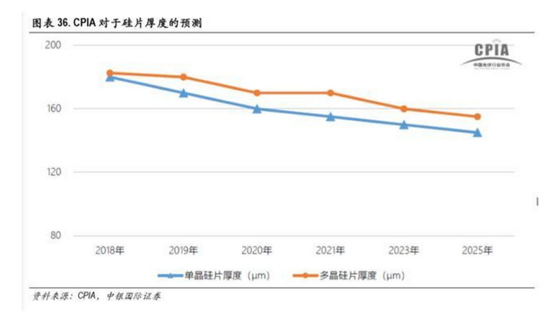 與主流單晶 PERC電池不同的是,異質(zhì)結(jié)電池在材料上以 N型硅片為基底。N型硅片在電學(xué)性能上較 P 型硅片更為優(yōu)越,但也因?yàn)閷?duì)硅料純度要求提高且生產(chǎn)成本相對(duì)較高等原因,目前市場(chǎng)價(jià)格相對(duì) 于 P 型硅片存在 8%-10%的小幅度溢價(jià),但同時(shí)異質(zhì)結(jié)電池單片功率提升(23.5%轉(zhuǎn)換效率對(duì)應(yīng)約 5.74W,單晶 PERC單片功率約 5.5W)對(duì)此溢價(jià)有攤薄效果,攤薄后單位溢價(jià)約 0.02元/W。此外,目 前行業(yè)主流單晶硅片厚度為 180μm,N型與 P型硅片厚度亦基本一致。但 N型硅片具備更高的減薄潛 力,異質(zhì)結(jié)電池已有 100μm 以下厚度的試驗(yàn)產(chǎn)品,轉(zhuǎn)換效率超過 24.5%。預(yù)計(jì)隨著硅片薄片化趨勢(shì)的 持續(xù),異質(zhì)結(jié)電池硅片成本有望得到進(jìn)一步降低,并取得相對(duì)于 P型電池的比較優(yōu)勢(shì)。