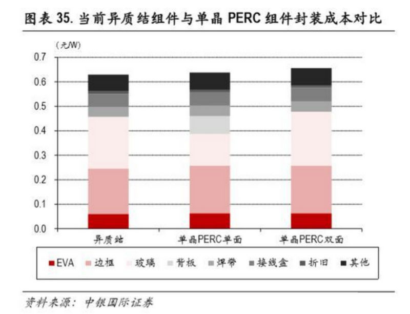 光伏組件封裝成本主要由折舊、材料、人工及其他成本組成,其中材料包括邊框、玻璃、背板、EVA 膠膜、焊帶、接線盒等。異質(zhì)結(jié)組件在外形與使用的材料種類上與單晶 PERC 組件基本一致,但生 產(chǎn)設(shè)備投資略高,同時(shí)其較高轉(zhuǎn)換效率帶來的同面積下更高的發(fā)電功率可攤薄部分的材料成本。我 們對(duì)典型情況下異質(zhì)結(jié)組件與單晶 PERC組件的封裝成本進(jìn)行了比較,其中異質(zhì)結(jié)為雙面雙玻組件, 標(biāo)定功率 335W;單晶 PERC 為單面組件,標(biāo)定功率 320W。結(jié)果顯示異質(zhì)結(jié)組件封裝成本相較單晶 PERC略低約 0.01元/W;如單晶 PERC采用雙面雙玻組件,異質(zhì)結(jié)成本優(yōu)勢(shì)將拉大至 0.025-0.03元/W。