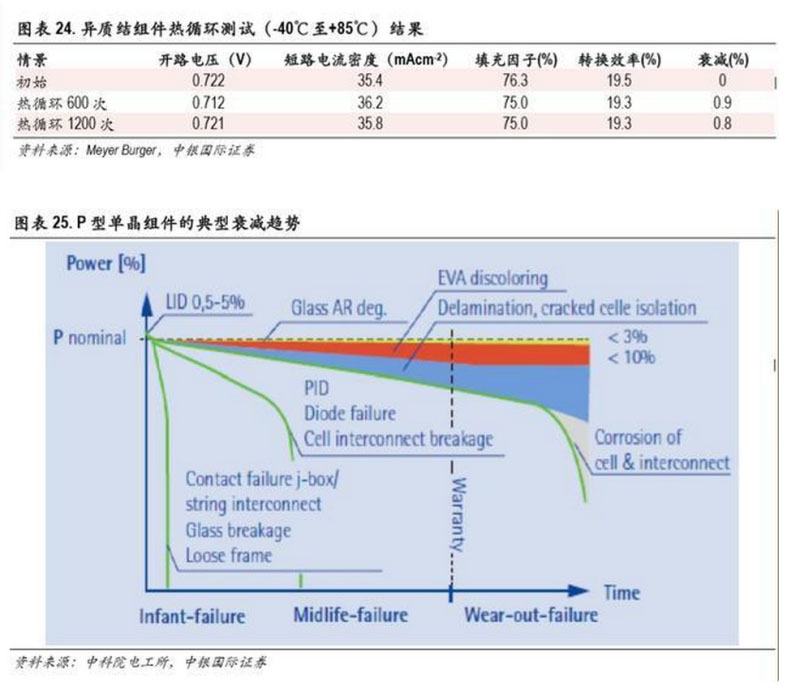 基本無光衰且可薄片化:目前在產(chǎn)的異質(zhì)結(jié)電池基本均為 N型硅片襯底,因此也具備 N型硅片相對(duì) 于目前主流 P型硅片的固有優(yōu)勢(shì),如無光致衰減(LID)和可薄片化(異質(zhì)結(jié)結(jié)構(gòu)本身亦對(duì)可薄片化 有所貢獻(xiàn))。N型硅片摻雜物質(zhì)為磷,硼含量極低,因此由硼氧對(duì)(B-O)導(dǎo)致的光衰(LID)基本可 以忽略,可提升電池片使用壽命和長(zhǎng)期發(fā)電量。同時(shí),可薄片化意味著同片數(shù)的電池對(duì)應(yīng)更少的硅 用量,有助于在硅成本方面形成比較優(yōu)勢(shì)。