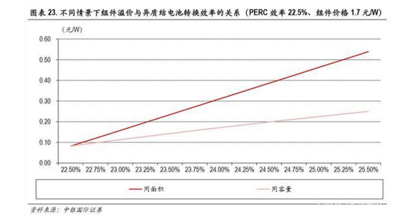 如考慮屋頂分布式光伏的典型情況,即項(xiàng)目經(jīng)濟(jì)性測(cè)算時(shí)的約束條件非裝機(jī)容量而是屋頂面積,異 質(zhì)結(jié)組件高轉(zhuǎn)換效率帶來的高發(fā)電功率優(yōu)勢(shì)將更為明顯地體現(xiàn)出來。對(duì)比同面積(屋頂分布式)與 同容量(地面電站)兩種情景下異質(zhì)結(jié)組件合理溢價(jià)與電池轉(zhuǎn)換效率的關(guān)系,可以得到在無其他發(fā) 電增益的情況下,異質(zhì)結(jié)組件溢價(jià)在同容量情景下的變化范圍為 0.082-0.250元/W,幅度約 0.17元/W, 而在同面積情景下的變化范圍為 0.082-0.539元/W,幅度約 0.46元/W;組件溢價(jià)對(duì)轉(zhuǎn)換效率的敏感性, 同面積情景明顯高于同容量情景。由此可以判斷,在一般情況下,相對(duì)于地面電站,屋頂分布式光 伏使用異質(zhì)結(jié)電池更為劃算,異質(zhì)結(jié)電池對(duì)單晶 PERC的性價(jià)比優(yōu)勢(shì)或先出現(xiàn)于屋頂分布式。