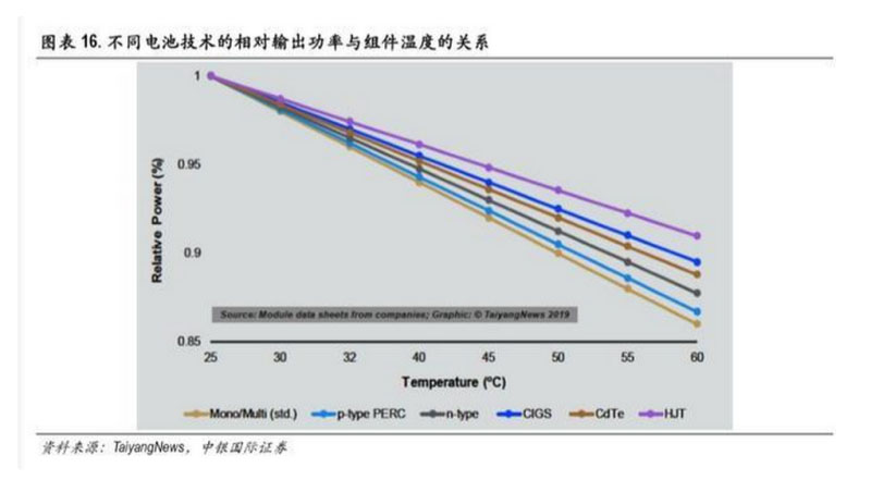 低溫度系數(shù)提高發(fā)電穩(wěn)定性:光伏電池在發(fā)電的過程中由于太陽光的照射和自身電流產(chǎn)生的熱效應(yīng), 電池表面溫度會(huì)有一定程度的上升。一般情況下當(dāng)溫度上升時(shí),光伏電池的開路電壓下降、短路電 流上升,且電壓降幅一般大于電流升幅,因此溫度上升一般會(huì)導(dǎo)致電池轉(zhuǎn)換效率下降。目前主流的 單晶 PERC電池的溫度系數(shù)一般在-0.4%/℃(即溫度每升高 1℃,發(fā)電功率相對(duì)于基準(zhǔn)功率降低 0.4%) 左右,而異質(zhì)結(jié)電池的溫度系數(shù)僅約-0.25%/℃,因此在長(zhǎng)時(shí)間光照溫度升高的情況下,使用異質(zhì)結(jié) 電池的光伏電站發(fā)電量和發(fā)電穩(wěn)定性都更高。