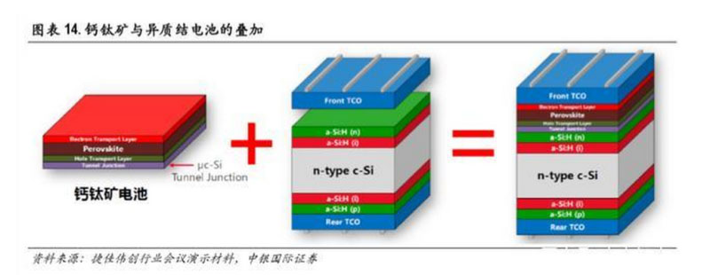 異質(zhì)結(jié)疊加鈣鈦礦進(jìn)一步提升效率上限:在疊加 IBC技術(shù)成為 HBC電池的路徑之外,異質(zhì)結(jié)電池同 時(shí)也比較適合疊加鈣鈦礦成為疊層/多結(jié)電池。疊層技術(shù)需要用低溫沉積工藝(PVD/CVD 方式)實(shí)現(xiàn) 短波長(zhǎng)吸收(鈣鈦礦)和長(zhǎng)波長(zhǎng)吸收(HJT)的結(jié)合,其所應(yīng)用的 TCO膜層已然在異質(zhì)結(jié)電池中采用, 而在 HJT單結(jié)中損失的藍(lán)光可被上層鈣鈦礦收集利用。整體而言,HJT與鈣鈦礦在兼容性上有著天然 的優(yōu)勢(shì),目前英國 Oxford PV的疊層電池已獲得了 28%的實(shí)驗(yàn)室轉(zhuǎn)換效率,后續(xù)甚至有望進(jìn)一步提升 至 30%以上。