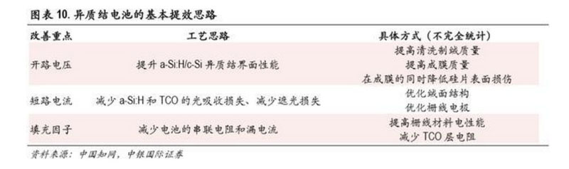 異質(zhì)結(jié)電池仍有進(jìn)一步提效空間:異質(zhì)結(jié)電池轉(zhuǎn)換效率已位居晶硅電池前列,但其仍有進(jìn)一步的提 效空間。在不改變其結(jié)構(gòu)的基礎(chǔ)上,可以從提高開路電壓、短路電流、填充因子三方面著手提效。 而異質(zhì)結(jié)電池的內(nèi)部結(jié)構(gòu)亦具備與其他技術(shù)路線或工藝的可疊加性,可在優(yōu)化內(nèi)部結(jié)構(gòu)的基礎(chǔ)上吸 取其他工藝的優(yōu)點(diǎn)進(jìn)一步提高電池轉(zhuǎn)換效率。
