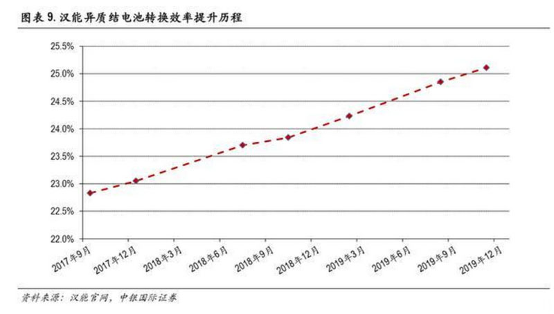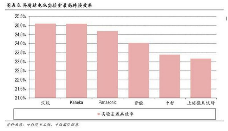 純異質(zhì)結(jié)電池實(shí)驗(yàn)室轉(zhuǎn)換效率已超過 25%:在日本松下/Sanyo之外,目前國內(nèi)外對(duì)異質(zhì)結(jié)電池的研究 已大范圍展開,轉(zhuǎn)換效率亦逐步攀升?,F(xiàn)在在 M2的標(biāo)準(zhǔn)硅片尺寸下,純異質(zhì)結(jié)結(jié)構(gòu)電池的轉(zhuǎn)換效率 世界紀(jì)錄為 25.11%,由我國漢能成都研發(fā)中心創(chuàng)造,且此轉(zhuǎn)換效率是在使用量產(chǎn)設(shè)備和量產(chǎn)工藝的 前提下取得的,具備相當(dāng)程度的量產(chǎn)可能性。