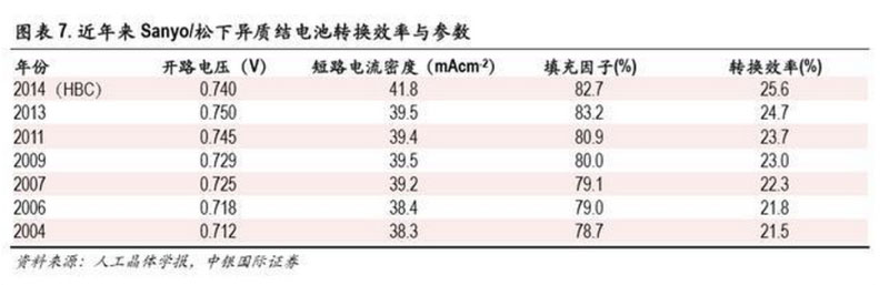 HJT電池轉(zhuǎn)換效率已在晶硅光伏電池中位居前列:HJT電池量產(chǎn)之后,日本 Sanyo/松下仍在持續(xù)研究 提高其光電轉(zhuǎn)換效率,近年來 HJT電池轉(zhuǎn)換效率已在晶硅光伏電池中位居前列。