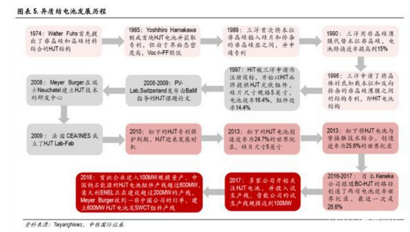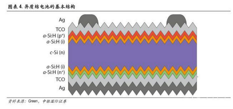 異質(zhì)結(jié)電池與同質(zhì)結(jié)電池的差異:廣義而言,p-n結(jié)由兩種不同類型的半導(dǎo)體材料組成的太陽能電池 均可稱為異質(zhì)結(jié)太陽能電池,與之相對(duì)的是同質(zhì)結(jié)電池,即 p-n結(jié)由同種半導(dǎo)體材料組成。目前實(shí)際 商業(yè)應(yīng)用的晶硅太陽能電池基本均為同質(zhì)結(jié)電池(p-n結(jié)由晶體硅材料形成),而產(chǎn)業(yè)中一般所提到 的異質(zhì)結(jié)電池則是指 p-n結(jié)由非晶硅和晶體硅兩種材料形成的電池,其中含本征非晶硅薄膜的異質(zhì)結(jié) 電池(Heterojunction with Intrinsic Thin-Layer,HIT/HJT,下稱“HJT電池”或“異質(zhì)結(jié)電池”)轉(zhuǎn)換效率 較為優(yōu)秀,受到的關(guān)注度相對(duì)較高,與大規(guī)模產(chǎn)業(yè)化的距離亦相對(duì)更近。