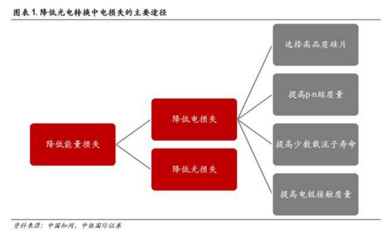 鈍化是提高光伏電池轉(zhuǎn)換效率的重要途徑:一般而言,提升光伏電池片光電轉(zhuǎn)換效率的核心是降低 光電轉(zhuǎn)換過程中的能量損失,主要是光損失與電損失。其中降低電損失的主要方法包括選擇高品質(zhì) 硅片、提高 p-n結(jié)質(zhì)量、提高少數(shù)載流子壽命、降低材料體電阻等。在提高少數(shù)載流子壽命這一途徑 中,通過改善晶面缺陷來降低襯底硅片表面的復(fù)合速率(即鈍化接觸)是光伏電池提效的重要研究 和產(chǎn)業(yè)化方向。