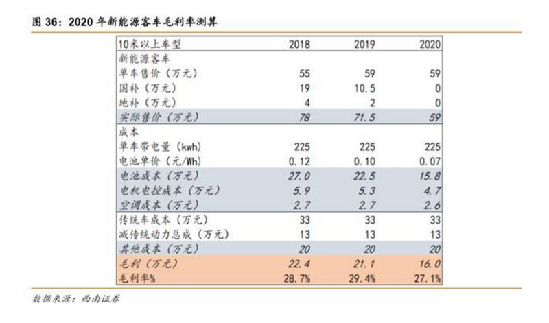 基于 2019 年已經(jīng)有很多一線整機(jī)廠采用 CTP 的方案進(jìn)行上車測試,所以預(yù)計(jì) 2020 年 會于一部分的車型開始采用該技術(shù)。我們按照上文的假設(shè),以 10 米以上的車型進(jìn)行測算, 電池成本降低 30%,則電池成本從 22.5 萬降低到 15.8 萬,在沒有補(bǔ)貼的情況下,毛利率可 以維持。