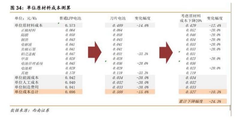 1) 刀片電池體積比能量密度提升 50%左右,在帶電量不變的情況下,體積減少了三分 之一左右,從而帶動鋁殼蓋板、PACK 成本下降,假設(shè) 33%降幅
