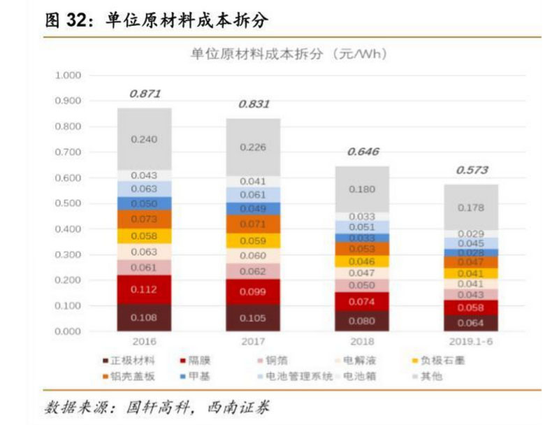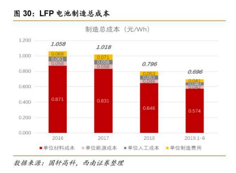 因此根據(jù)上述兩組數(shù)據(jù),我們可以算出 LFP 電池的制造成本。2016 年為 1.058 元/Wh, 而在 2019 年上半年已經(jīng)低于 0.7 元/Wh,主要是由于原材料成本由 2016 年的 0.871 元/Wh 下降到 2019 年上半年的 0.574 元/Wh,絕對降幅 0.3 元/Wh,相對降幅 34%。