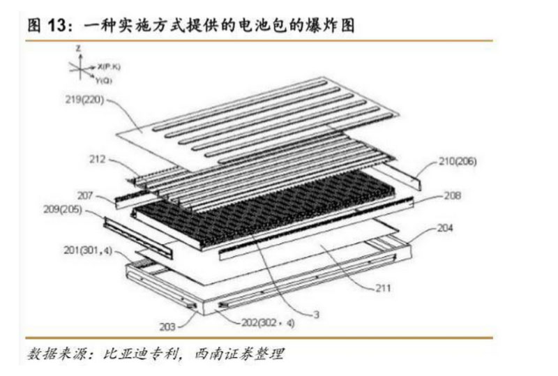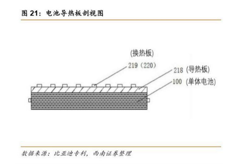 關(guān)于電池模組中散熱性能,比亞迪通過設(shè)置導(dǎo)熱板(下左圖 218 處)和換熱板來進(jìn)行溫 度的控制,以保證單體電池散熱,并保證多個單體電池之間的溫度差不會過大。導(dǎo)熱板可以 由導(dǎo)熱性好的材料制成,例如導(dǎo)熱系數(shù)高的銅或鋁等材料制成。換熱板(下右圖 219 處)內(nèi) 部設(shè)置有冷卻液,通過冷卻液來實(shí)現(xiàn)對單體電池的降溫,使單體電池能夠處于適宜的工作溫 度。由于換熱板與單體電池設(shè)置有導(dǎo)熱板,在通過冷卻液對單體電池進(jìn)行冷卻時,換熱板各 位置處的溫差可以通過導(dǎo)熱板進(jìn)行均衡,從而將多個單體電池之間的溫度差控制在 1℃以內(nèi)。