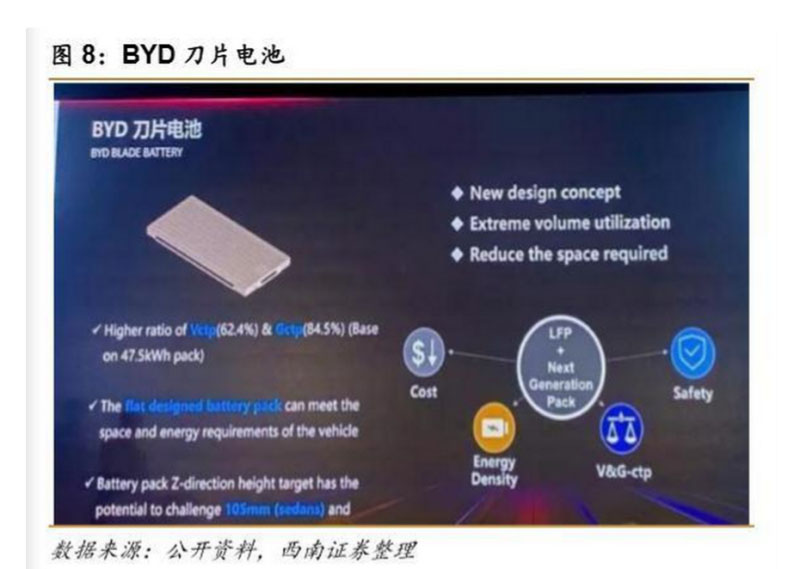 比亞迪董事長王傳福先生在參加電動車百人會時透露,比亞迪已研發(fā)出新一代磷酸鐵鋰 電池“刀片電池”,這款電池預(yù)計(jì)今年量產(chǎn),“ 刀片電池”在體積比能量密度上比傳統(tǒng)鐵電池 提升了 50%,具有高安全、長壽命等特點(diǎn),整車壽命可達(dá)百萬公里以上,能量密度可達(dá) 180Wh/kg,相比此前提升大約 9%,這一數(shù)據(jù)已經(jīng)不弱于 NCM811 的三元鋰電池,并且能 夠解決磷酸鐵鋰電池能量密度低的短板問題。這款電池將搭載在新車比亞迪“漢”上,預(yù)計(jì) 于今年 6 月上市。