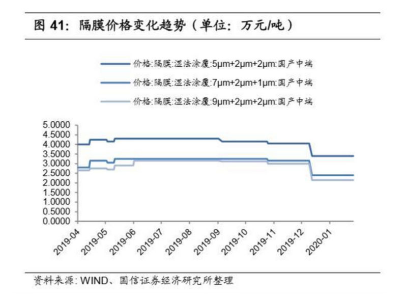 目前國內(nèi)隔膜行業(yè)已進(jìn)入淡季,出貨普遍不高。隔膜市場(chǎng)混亂,價(jià)格戰(zhàn)現(xiàn)象較 為嚴(yán)重,待行業(yè)整合結(jié)束,預(yù)計(jì)明年隔膜價(jià)格可能會(huì)回歸理性。本周隔膜價(jià)格 穩(wěn)定,其中 5μm 濕法基膜報(bào)價(jià) 2.5-3.3 元/平方米;5μm+2μm+2μm 濕法涂覆隔 膜報(bào)價(jià)為 3-3.8 元/平方米;7um 濕法基膜報(bào)價(jià)為 1.8-2.2 元/平方米; 7μm+2μm+2μm 濕法涂覆隔膜報(bào)價(jià)為 2.2-2.6 元/平方米。動(dòng)力價(jià)格方面:14μm 干法基膜報(bào)價(jià)為 1-1.1 元/平方米;9um 濕法基膜報(bào)價(jià) 1.3-1.7 元/平方米; 9μm+2μm+2μm 濕法涂覆隔膜報(bào)價(jià)為 1.8-2.5 元/平方米。