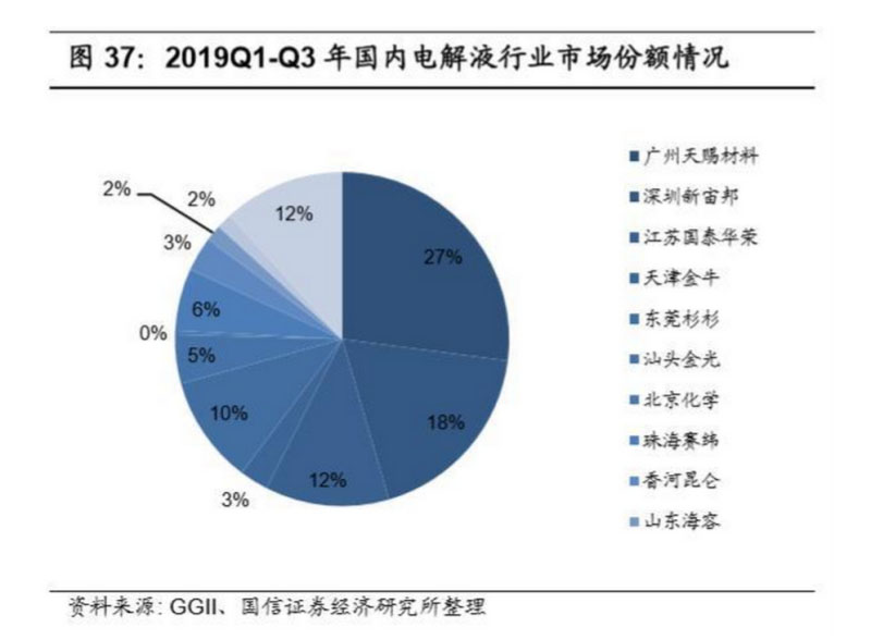 電解液行業(yè)集中度提升,龍頭企業(yè)盈利情況有望復(fù)蘇。2018 年伴隨行業(yè)價(jià)格戰(zhàn) 的進(jìn)行,行業(yè)集中程度及一步提升,較為明顯的變化是第一梯隊(duì)新宙邦的行業(yè) 份額提升明顯,江蘇國泰華榮市場(chǎng)份額下降明顯,而第二三梯隊(duì)包括珠海賽維、 香河昆侖、天津金牛等市場(chǎng)份額急劇萎縮。伴隨行業(yè)價(jià)格戰(zhàn)延續(xù)以及下游客戶 對(duì)于電解液產(chǎn)品要求的提升,行業(yè)尾部產(chǎn)能將進(jìn)一步出清,同時(shí)對(duì)現(xiàn)有廠商在 技術(shù)研發(fā)和產(chǎn)能布局方面也提出更高的要求。