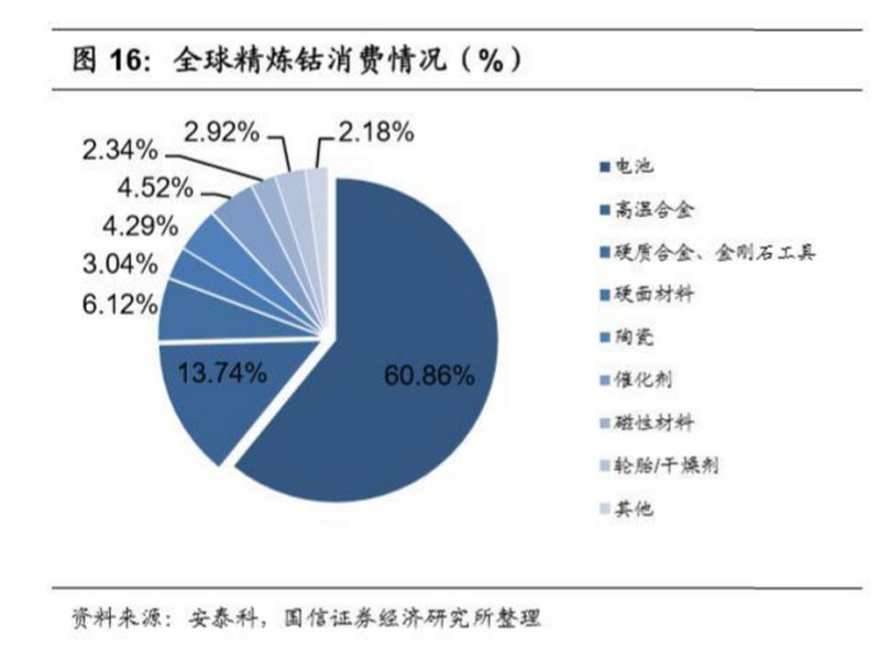 鈷的物理、化學(xué)性質(zhì)決定了它是生產(chǎn)耐熱合金、硬質(zhì)合金、防腐合金、磁性合 金以及各種鈷鹽的重要材料、下游被廣泛應(yīng)用于電池、制取合金、制取顏料、 醫(yī)療等領(lǐng)域。根據(jù)安泰科統(tǒng)計(jì),2018 年全球精煉鈷總體需求量約為 12.6 萬噸, 同比增長(zhǎng)接近11.5%,其中電池行業(yè)用鈷量約為7.8萬金屬噸,占比約為60.86%, 高溫合金用鈷量約為 1.76 萬金屬噸,占比約為 13.74%,其他行業(yè)用鈷量較為 平均;而中國鈷消費(fèi)量約為 6.47 萬噸,同比增速達(dá)到 19.81%。2019 年以來受 全球經(jīng)濟(jì)不確定性影響以及中美貿(mào)易戰(zhàn)為代表的國家間的貿(mào)易保護(hù)對(duì)消費(fèi)起到 一定的抑制作用,鈷下游領(lǐng)域 3C 市場(chǎng)處于低迷期,航空業(yè)以及硬質(zhì)合金等行 業(yè)均受到波及,新能源汽車領(lǐng)域一枝獨(dú)秀但基數(shù)較小。