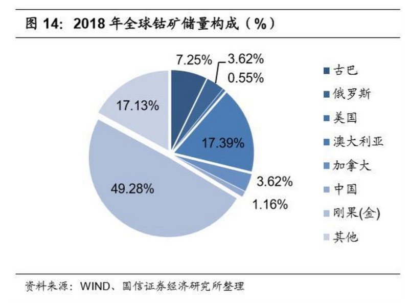 全球鈷礦資源接近 50%來源于剛果(金)。根據(jù)美國地質(zhì)勘探局統(tǒng)計(jì),2018 年 全球鈷礦儲(chǔ)量為 690 萬公噸,其中接近 50%左右來源于剛果金,澳大利亞、古 巴、俄羅斯、加拿大、中國、美國、贊比亞等也均有分布。而從產(chǎn)量角度來看, 2018年全球鈷礦產(chǎn)量為14萬公噸,其中剛果(金)為9萬公噸,占比達(dá)到64.29%, 是絕對(duì)的鈷資源大國。