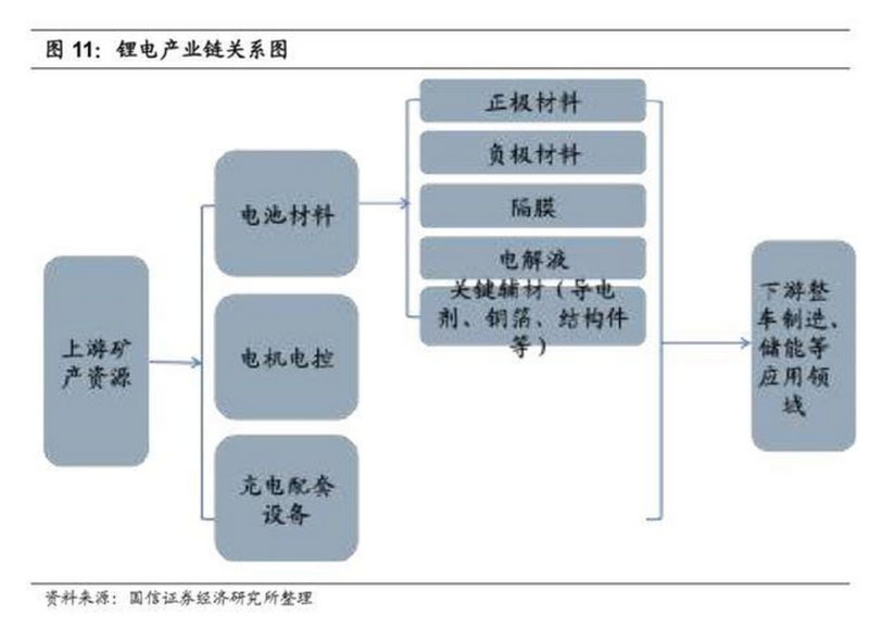 上游鈷鋰原材料、中游鋰電池制造、電機(jī)電控及充電設(shè)備、下游整車廠