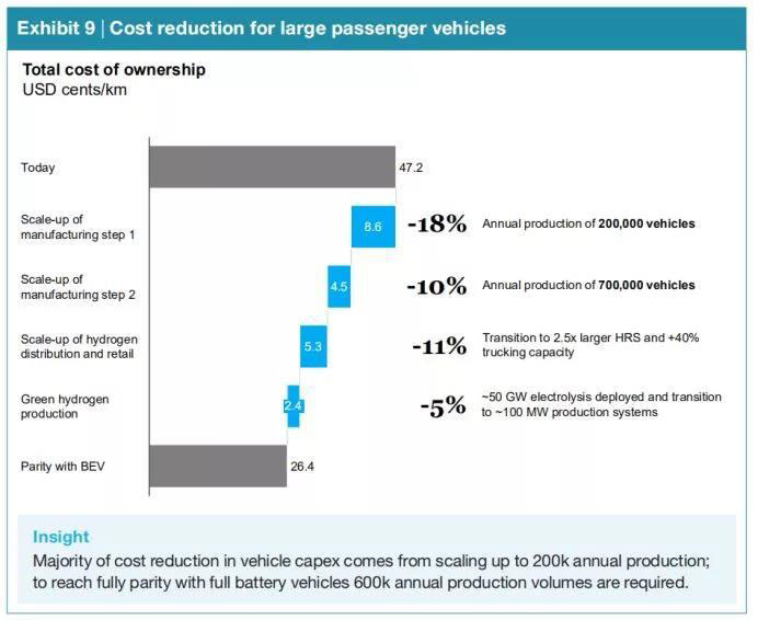 到2030年,大型乘用車的TCO可能下降約45%,這主要受三個(gè)主要因素的影響:低成本的汽車資本支出,低成本的氫氣分銷和零售以及低成本的氫氣生產(chǎn)。這些成本降低對(duì)于實(shí)現(xiàn)與BEV的成本均等至關(guān)重要。