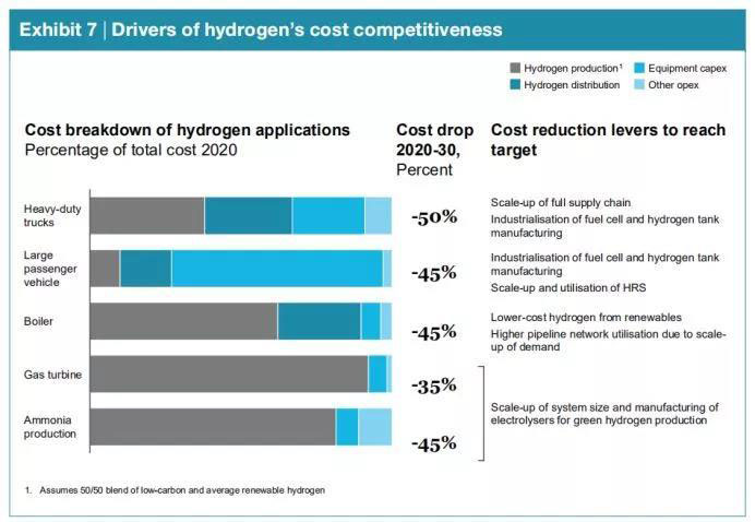 報(bào)告指出,氫能解決方案的成本將在未來10年急劇下降,遠(yuǎn)遠(yuǎn)超出此前預(yù)期。隨著氫氣生產(chǎn)、分銷、裝備和零部件制造規(guī)模不斷擴(kuò)大,預(yù)計(jì)到2030年氫能產(chǎn)業(yè)鏈整體成本將下降50%。