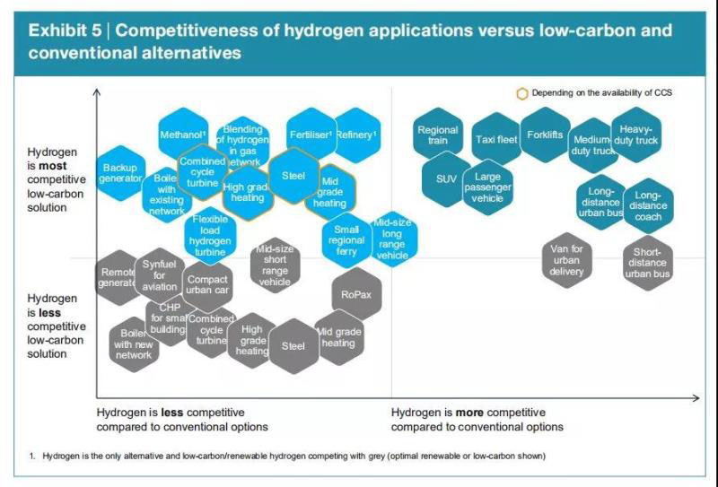 在另外9個(gè)案例中,氫能的成本競(jìng)爭(zhēng)力甚至可以堪比傳統(tǒng)化石能源解決方案,包括用于長(zhǎng)途運(yùn)輸?shù)闹匦蛙囕v和叉車等。