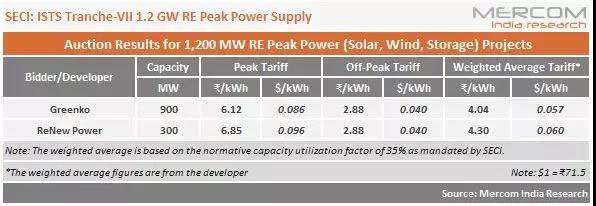 其中,Greenko以6.12盧比(約合0.086美元)/kWh的峰值電價(jià)中標(biāo),項(xiàng)目規(guī)模為900MW。ReNew Power的中標(biāo)價(jià)格為6.85盧比(約合0.096美元)/kWh,項(xiàng)目規(guī)模為300MW。