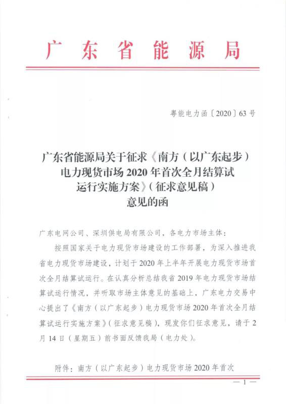 2月6日,廣東省能源局下發(fā)關(guān)于征求《南方 (以廣東起步) 電力現(xiàn)貨市場(chǎng)2020年首次全月結(jié)算試運(yùn)行實(shí)施方案》(征求意見(jiàn)稿)意見(jiàn)的函(以下簡(jiǎn)稱《方案》),計(jì)劃于今年上半年開(kāi)展電力現(xiàn)貨市場(chǎng)首次全月結(jié)算試運(yùn)行。